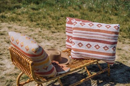 Muted earth tones and southwest-inspired and geometric shapes come together in a set of pillows that’s sure to evoke a sense of canyon adventures and desert heat.