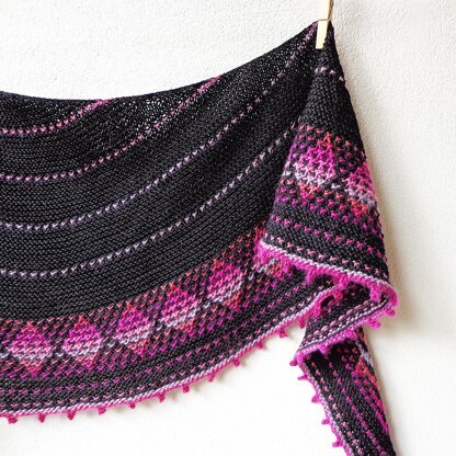 It is knit in garter stitch combined with slipped stitches in two colours. The fun colourwork band that is placed along the bottom of the shawl is creating an eye-catching item which is easy and cosy to wear.