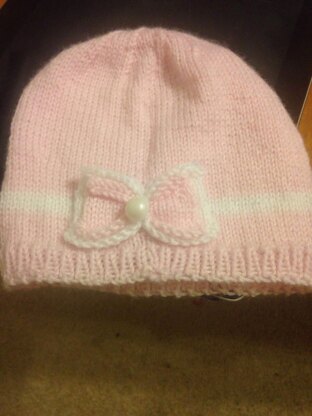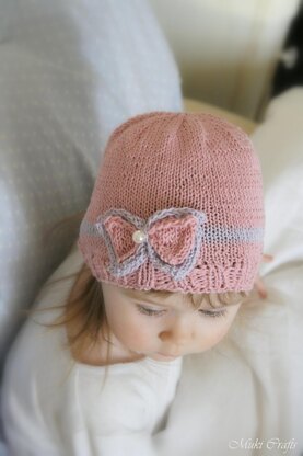 This advanced beginner level knitting pattern includes step-by-step instructions for four sizes (6 months, 1 year, 3 years, and child) and offers a snug fit thanks to its gentle negative ease. The hat is finished with two delicate bows and a decorative bead for a special touch.