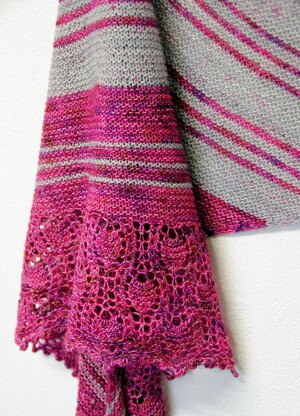 Zusammen is a two-color shawl with an asymmetrical triangle shape. The shawl is knitted in fingering-weight yarn and features garter stitch, short rows, stripes, and lace… all the things you love! Pick two skeins of different colors and let them blend together. Use colors with a strong contrast to create a striking, graphic look, or two complementary colors for a smooth and subtle effect.