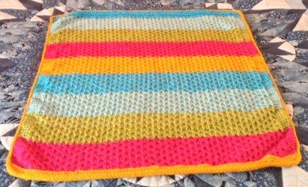 Loved the 'ice cream' colours in the Caron Cakes and thought it would make a nice blanket for in the car or stroller. Found the pattern for Ross's Blanket here and went from there. Made a mistake following the garter stitch border and went to stockinette stitch on side borders so incorporated by alternating garter and stockinette up the sides. At the end added an attached I-cord to balance the stripes. If I had done a solid colour wouldn't have needed it although I find the I-cord helps hold the shape. The Caron Cakes is 80% acrylic and 20% wool . I used 1.5 balls to complete the blanket. Each ball is 7.1 oz. I found it easy to knit with, nice in the hands, and makes for a nice warm and soft blanket. The photo doesn't do justice to the colours which are brighter.