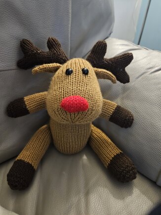 A colleague asked me for 2 reindeers to put in a Christmas Eve box for her two children. Loved the look of this pattern, but could only get the brown wool colour in photo as short notice to knit and I fancied giving him a red nose. Made 1, got one more to do.