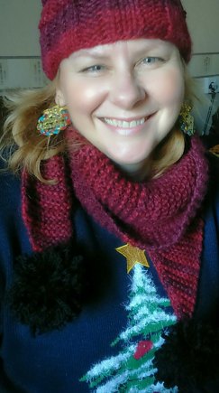 A special scarf for birthday on Christmas day to match pompom hat. I absolutely love the pattern, using singular wool as don't know what other colours to put with my beautiful wool. Some new stitches to learn in this one. Wish me luck!...since starting project my work is a bit wonky, totally to do with me chatting and daydreaming than the pattern. Then realised less than half way through that all my wool was running out.eek! I am a bit frustrated with my beginners errors but will show it when it is finished...with pompoms on, several attempts at pompoms, it doesn't look too bad. It's a miracle. Phew!