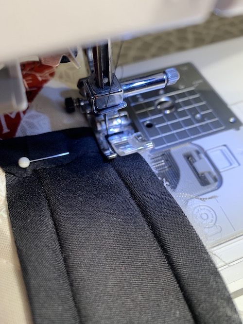 Place the small glove sections at either end of the long piece and pin in place, matching seams and corners. Machine these in place with either a zigzag or running stitch, again, trim any excess.