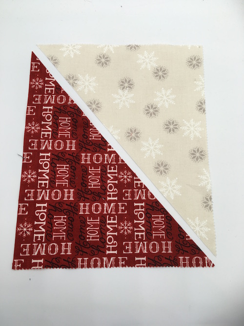 Start by sewing together two of the triangle pieces (which will form a rectangle) and press open the seams – this will form the centre block.