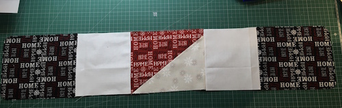 Sew the plain blocks onto either side of the triangle piece, using ¼“ seam allowance, followed by the glove ends and press all seams open.