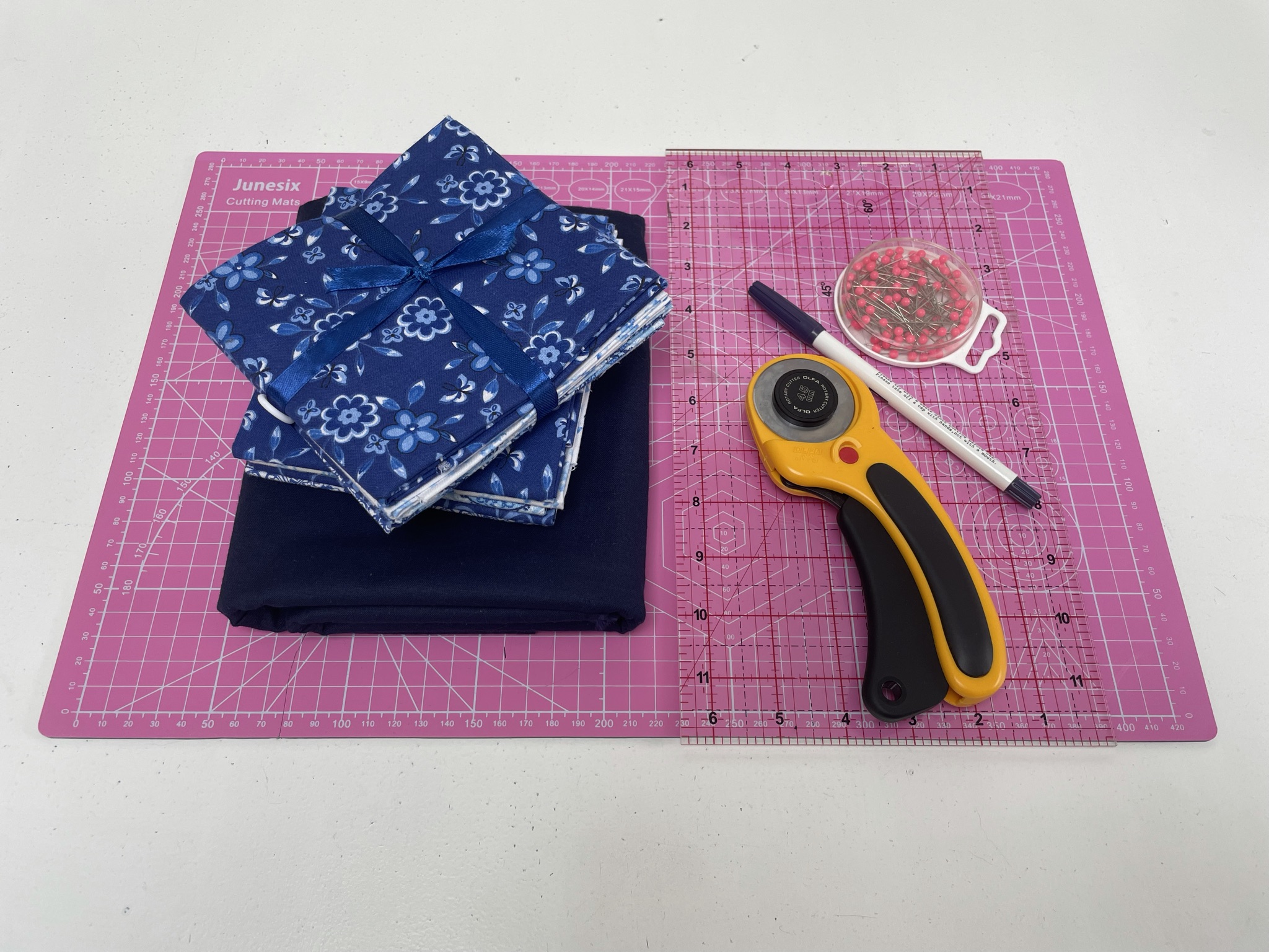 My finished quilt size is going to be 35.5” x 31.5” (90 x 80cm) and I’m using two fat quarter packs, which each have 5 fabrics. I’ll be using the same patterned fabric on the front and back of each square, with a navy fabric in the middle.