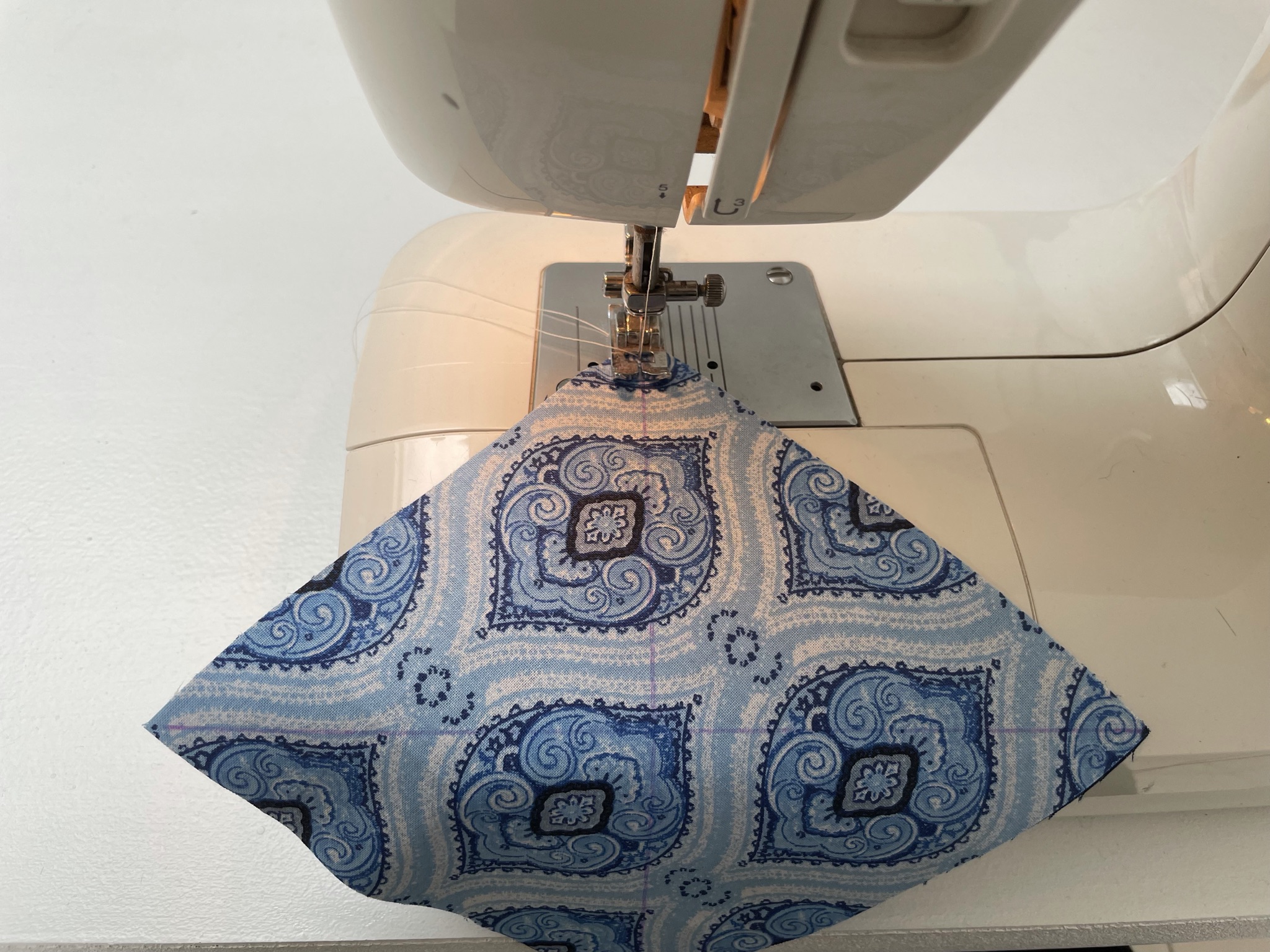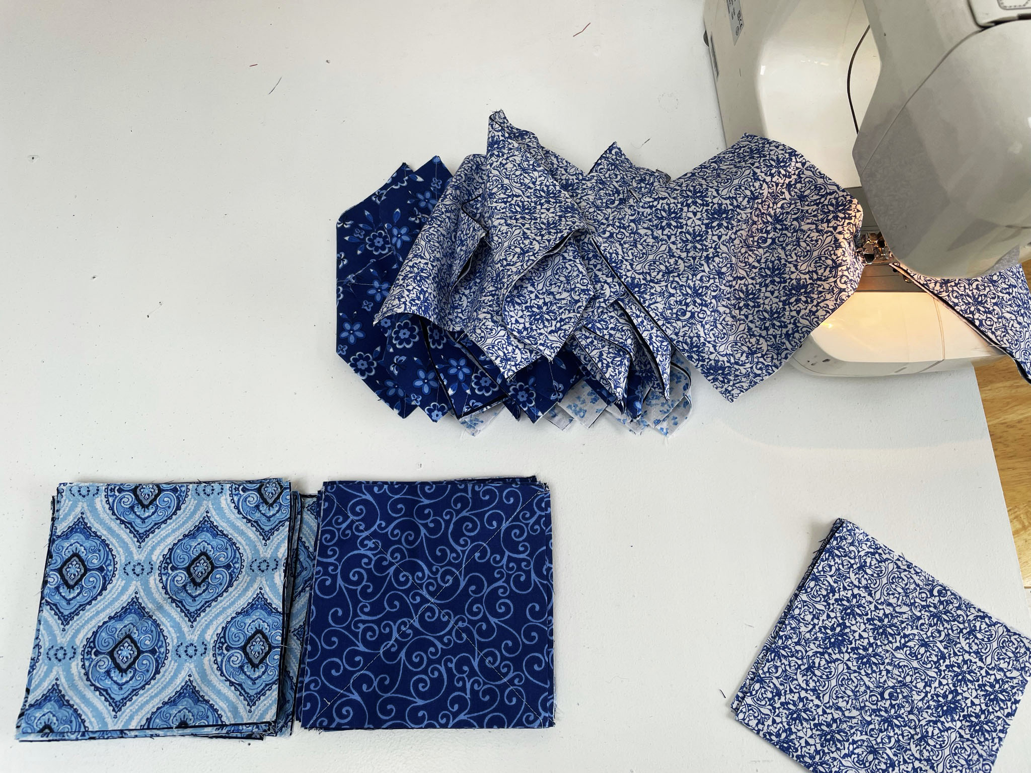 If you’d like to save time (and thread!) why not try ‘chain piecing’? This is when you sew several pieces in a row without stopping, then simply snip them apart once you’re done. Here I’ve done all my diagonal stitches in one direction across the squares, then I’ve snipped them apart and have sewn all the diagonal stitches in the other direction.