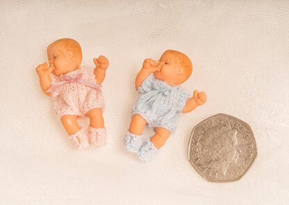 This outfit was designed to fit the sweet little rubber baby dolls that are used in dolls' houses. It is to fit the one sucking their thumb and therefore the outfit is non-removable. The romper is knitted in one piece using 1ply acrylic yarn and miniature knitting needles size 19. A lovely little silk bow finishes the romper off nicely. Instructions for a pair of booties is included.