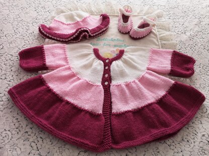 Instructions for a simple but pretty tiered baby coat in 3 colours. The coat has a gathered yoke and fastens at the front with 4 buttons. There is a matching sun hat and Mary Jane shoes. This is an ideal pattern for when you are watching box sets as it is easy to keep track of where you are in the pattern if you reach an exciting part in your programme and get distracted!