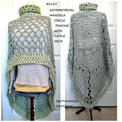 CROCHET PATTERN, #1127 - ASYMMETRICAL Mandela Circle Poncho with Turtle Neck. WRITTEN PATTERN AND PRIVATE VIDEO DEMO FOR BUYERS ONLY. . Yarn requirement: 560 yards of main color (worsted weight yarn, ……( if using 2 strands of double knitting, double that to 1120 yards)