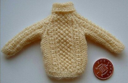 Approximate finished sizes: Aran sweater:2½-inches/6 cm tall, 1½-inches/4 cm across chest. Hat: ¾-inch/2 cm from brim to top of head. Socks: foot length ¾-inch/2 cm, leg length 1-inch/2.5 cm (these may also be worn turned down over boot tops)