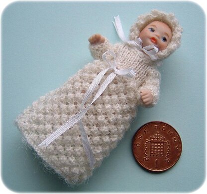 Approx finished sizes: Dress 6 cm high x 2 cm wide at chest, Shawl 12.5 cm square, Bonnet - 1.25 cm tall.
