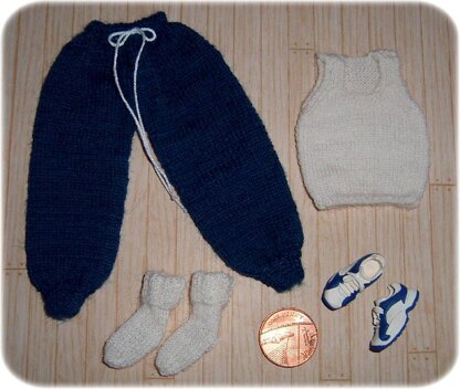 Finished sizes: Vest – 5.5 cm/2¼-inches neck to hem, 4.5 cm/1¾-inches across chest. Socks - foot length 2.5 cm/1-inch, 2 cm/¾-inch top to heel with top turned down. Jogging pants – inside leg 8 cm/3¼-inches, waist 3.5 cm/1¼-inch, waist to hem 11 cm/4½-inches.