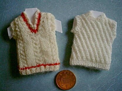 Approximate finished sizes: Cricket sweater- 2½-inches/6 cm tall, 1½-inches/4 cm across chest. Tennis pullover- 2¼-inches/5.5 cm tall, 1½-inches/4 cm across chest.