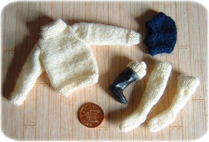 Finished sizes: Sweater – 6 cm/2½-inches neck to hem, 4 cm/1½-inches across chest, sleeve length 6 cm/2½-inches shoulder to wrist. Balaclava – 2 cm/¾-inch across neck, 3 cm/1¼-inches neck to top of head. Stockings - foot length 2.5 cm/1-inch, 4.5 cm/1¾-inches heel to turned down top.