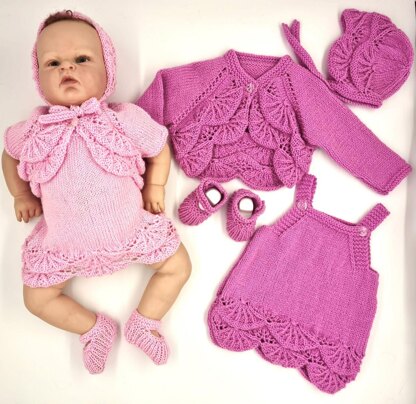 Another customer requested knitting pattern. The pattern has instructions for a scallop-edged long or short-sleeve bolero with a matching pinafore dress, bonnet with knitted straps and shoes. The finished set is suitable for any time of year, as the pinafore dress can be worn on its own or with the short sleeve bolero for the warmer months, or the pinafore can be worn with a t-shirt or sweater underneath with the long-sleeve bolero for the cooler months.
