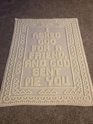 Blanket reads I ASKED GOD FOR A FRIEND AND GOD SENT ME YOU
