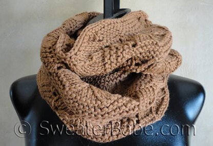This infinity scarf is a simple big loop, knit in the round on long circular needles. The stitch pattern is fabulous, so be sure to choose a yarn with great stitch definition. The cocoa color is rich and a natural complement to any outfit.
