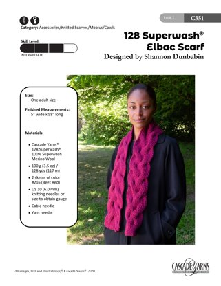 128 Superwash Elbac Scarf in Cascade Yarns - C351 - Downloadable PDF is a free Intermediate Knitting pattern by Shannon Dunbabin, available as a Downloadable PDF and includes instructions in English. Super fun to make, this pattern could be your next masterpiece!