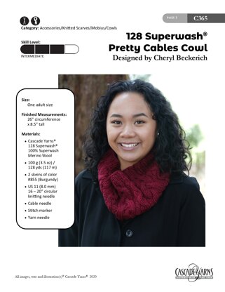128 Superwash Pretty Cables Cowl in Cascade Yarns - C365 - Downloadable PDF is a free Intermediate Knitting pattern by Cheryl Beckerich, available as a Downloadable PDF and includes instructions in English. Super fun to make, this pattern could be your next masterpiece!