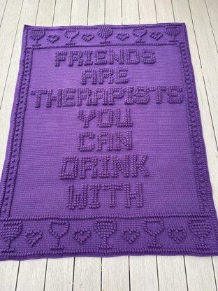 Blanket reads: FRIENDS ARE THERAPISTS YOU CAN DRINK WITH