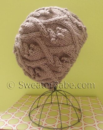 This hat features an intricate trellis cable pattern with bobble clusters set against Reverse Stockinette stitch. A generous shape provides the right amount of slouchiness and warmth, and a ribbed band keeps the hat positioned nicely on your head.