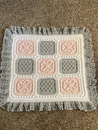 This baby blanket was made with I Love This Yarn: Pink: 800 yards White: 1100 yards Grey: 1100 yards