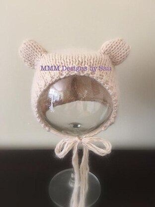 Description: This is a PDF KNITTING PATTERN for a cute Bear bonnet for use as a photo prop. Bonnet is knitted on straight needles and then stitched up at the end. No complicated knitting with DPK or knitting in the round.