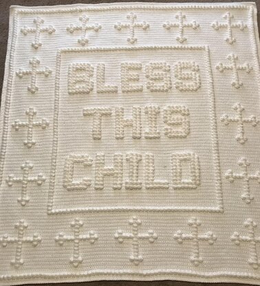 Blanket reads BLESS THIS CHILD Blanket in photo was made with Caron One Pound & G hook. Yarn choice, hook size & tension may alter finished size.