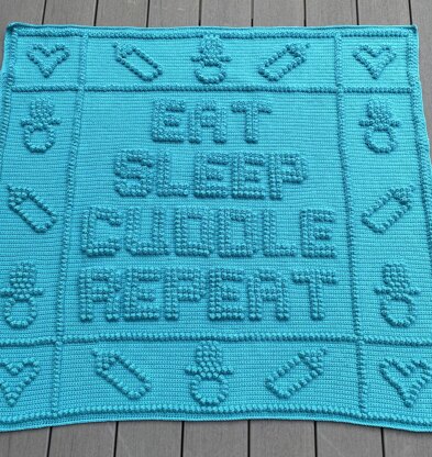 Blanket reads: EAT SLEEP CUDDLE REPEAT