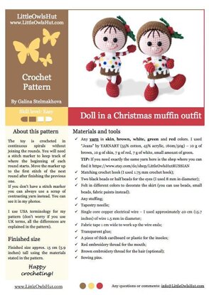 • Any yarn in skin, brown, white, green and red colors. I used “Jeans” by YARNART (55% cotton, 45% acrylic, 160m/50g) – 10 g of brown, 10 g of skin, 7 g of red, 7 g of white, small amount of green.