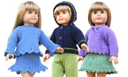 Three more doll sweaters, adorable miniature versions of three of Knitting at Knoon's classic children's designs — this time including skirts and slacks — all sized for 18" girl dolls (like American Girl® dolls). What girl wouldn't love for her doll to have a matching sweater? Each doll-sized sweater is designed to use the same yarn as our child-sized version. This collection is worked in worsted wt. Child-sized patterns sold separately.