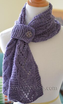 The bottom begins with pretty curvy vine lace panels separated by Garter stitch sections that narrow as you progress. The scarflette then transitions smoothly into a Spider lace stitch that continues around the neck.