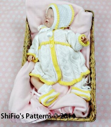 **Materials:**Med buttons for jacket 3, 3 Ribbon: 44”(102cm) of 1”(2.5cm) wide ribbon for hat, 36”(1mtr) of ¼”(0.25cm) for booties Spare needle if using the knit method to join picot row