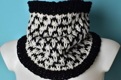This lovely neck warmer cowl is knit with chunky yarn on 7 and 8mm knitting needles.