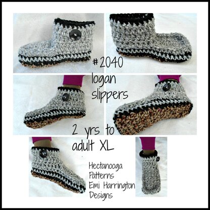 CROCHET PATTERN - LOGAN SLIPPERS- 2 YEARS TO ADULT XL (13 TO 14 INCH FOOT) Dense slippers, as they are worked with 2 strands of worsted weight yarn, (or you can use chunky yarn) Work up quickly! Great gift idea! . CLICK HERE TO ENTER MY RAVELRY PATTERN STORE: http://www.ravelry.com/designers/emi-harrington . CLICK HERE FOR close to 200 FREE PATTERNS: http://www.ravelry.com/patterns/search#sort=best&quer...Harrington free