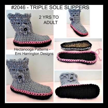 CROCHET SLIPPERS PATTERN. Make these slippers with or without the additional sole. Adding the sole results in a triple thickness sole, (one thickness for the actual slipper, and the sole is worked with 2 strands of ww yarn.) . All sizes from 2 yrs to adult XL . click here to enter my RAVELRY PATTERN STORE: http://www.ravelry.com/designers/emi-harrington . To see all my crochet slippers patterns,click here: http://www.ravelry.com/patterns/search#sort=best&quer...HARRINGTON%2C CROCHET SLIPPERS
