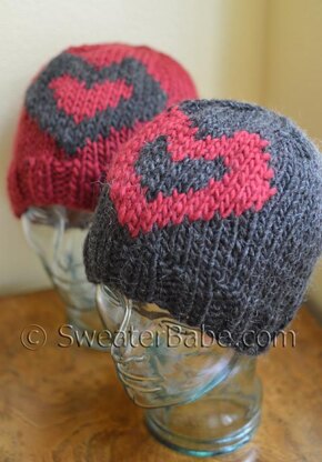 The bold, shaped heart motif can be worked surprisingly easily with a special technique (explained in pattern) that allows you to work an Intarsia design back and forth while keeping the hat worked in the round! For real!
