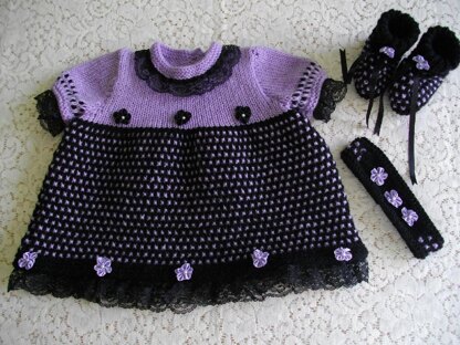 Instructions for a reborn or baby dress set in DK yarn. This set comprises of a dress, headband and bootees in a two colour slip stitch pattern. When knitted the set will fit a newborn baby upto 6-10lb or an 18-20 inch reborn doll. You will need 200g of main colour dk yarn, 100g of constrast colour dk yarn, 4 buttons, 4 metres of 1 inch gathered lace, 18 small satin flowers, 3.25mm needles, 4mm needles and 3 stitch holders to complete.