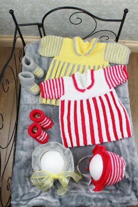 **UK Materials:**Double knitting, 3.75mm knitting needles Dress Main (cream/yellow) 60g, 70g Contrast (beige/grey) 40g, 50g Hat and bootees Main (cream/yellow) 30g, 40g Contrast (beige/grey) 25g, 30g