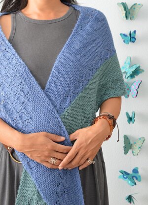 The asymmetrical triangular shawl begins at one corner with easy increases along both edges. As you progress with the first Garter stitch section, you'll quickly learn the increase pattern.