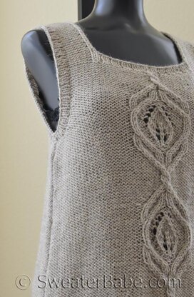 A beautiful center panel features a medallion-shaped double cable that frames a single lace-leaf motif. This pattern-stitch combination is all you need to embellish this vest, along with the required details, like neatly ribbed edges, handy pockets, and a nicely squared neckline.