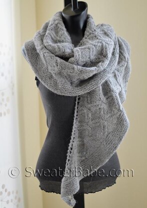 This shawl is big enough to wrap around your shoulders or wear multiple ways bundled around your neck. The cable is charted and written.