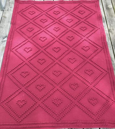 Blanket was made w/ Caron One Pound & G hook. Yarn choice, hook size & tension may alter finished size.