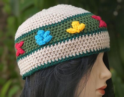 A crochet beanie pattern with overlay crochet flowers around the band, this cute hat looks good on girls and women.