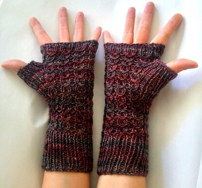 This is a pattern for 3 pair of knitted mitts with a cable, faux cable, textured sts, and lace motif, worked in the round from the bottom cuff up. Each pattern can be easily changed by working with smaller or larger needles in fingering to DK weight yarn. The samples shown, were worked in Malabrigo Arroyo sport weight.