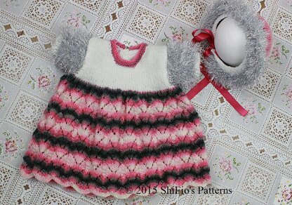 Sizes 3: 0-3mths , 3-6mths, 6-9mths Chest 18" (46cm) 20" (51cm) 22" (55cm) Length 12" (30cm) 13" (33cm) 14" (36cm) Materials: UK-DK, USA-Light Worsted (3), AU-8ply Coloured yarn 100g (3½oz), 120g (4¼oz), 140g (5oz) White yarn 40g (1oz), 55g (1¼oz), 70g (2oz) Eyelash yarn 35g (¾oz), 45g (1oz), 55g (1¼oz) Knitting needles UK 3.75mm USA 5 Ribbon 1 yd (1mtr) of 1" (2.5cm) wide for hat 3 medium buttons