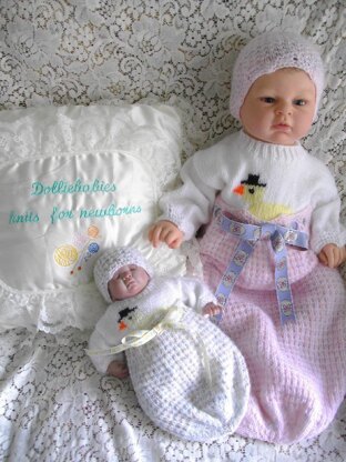 Instructions for a reborn doll or baby cocoon set in either 4ply or DK yarn depending on size. The set comprises of a pointed edge cocoon with matching beanie hat, and a sweater with a chick wearing a top hat motif which is worked from a chart. The pattern comes in 9 sizes from a 10" reborn through to a 22" reborn or 1lb - 0/3 month baby. You will need between 50-150g 4ply or double knitting yarn in main colour, 50-100g contrast colour 1 and oddments of yellow, orange and black yarn, either 2.75mm, 3.25, 3.75mm and 4mm needles, 3 stitch holders, between 1 and 2 metres of ribbon and 4 buttons.