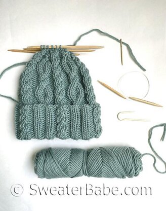 This hat is knit from the bottom up in the round, starting with a lovely, textured ribbed cable for the wide cuff. The hat then continues with five cable panels, including the addition of an open, more ornate cable. Decreases at the crown create a nice rounded shape at the top while tapering off the open cable design.